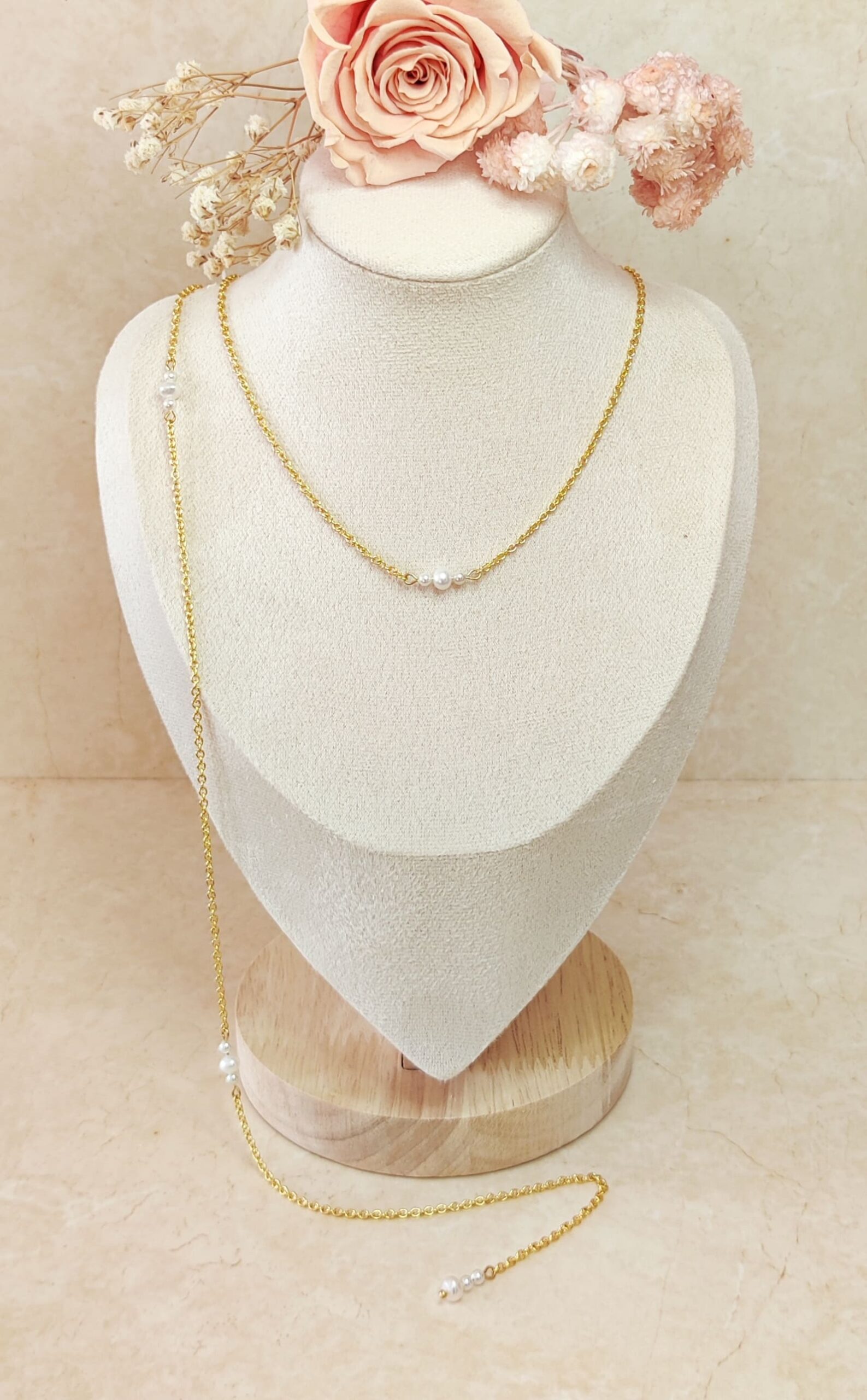 Basé sur le modèle Candice, il est composé d’un tour de cou de 42 cm et d’une chaîne qui tombe dans le dos d’une longueur de 40 cm, ornée de neuf petites perles de culture d’eau douce de 3 et 5,5 mm.