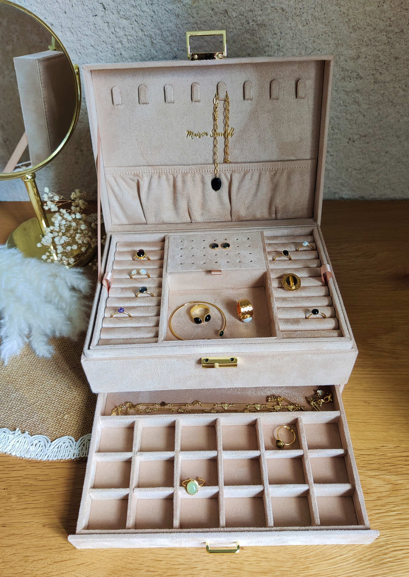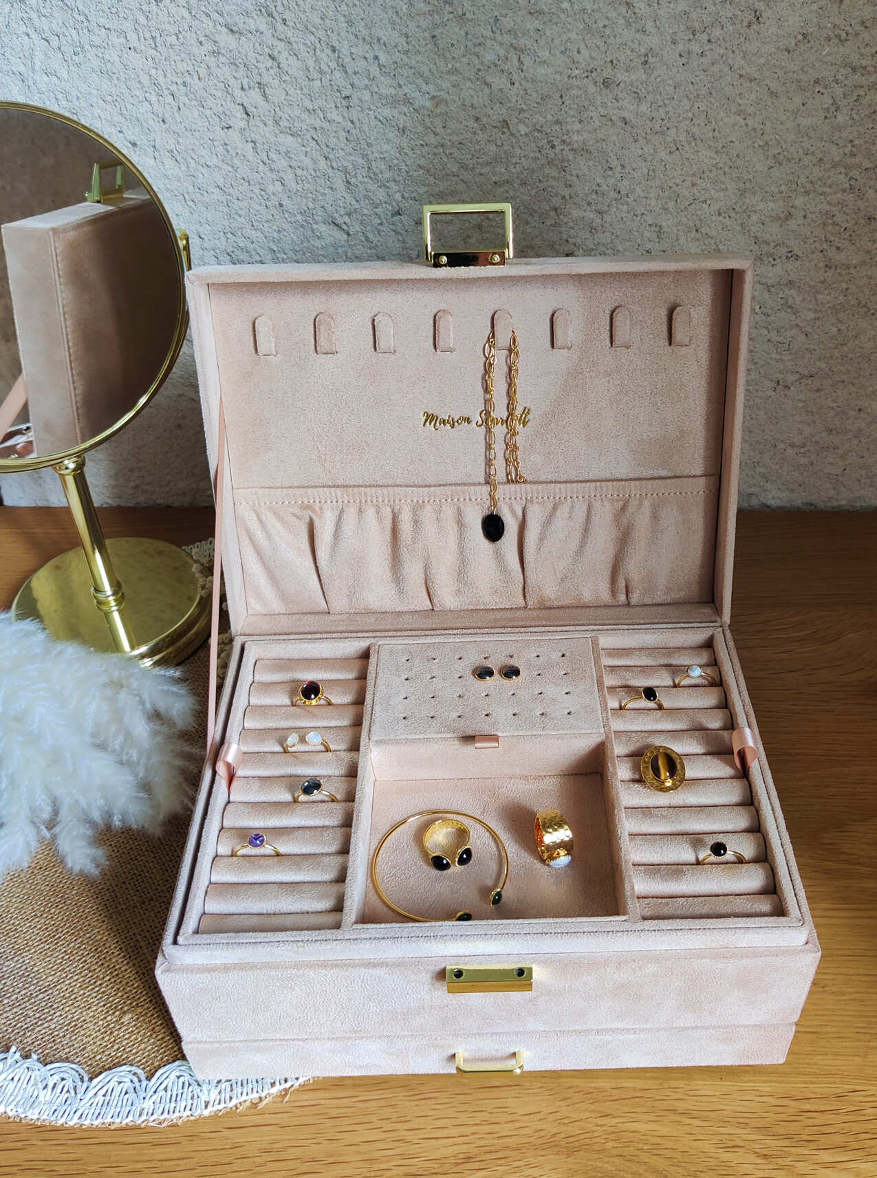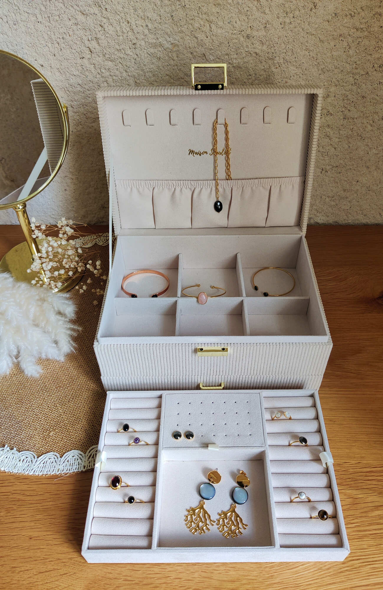 La boîte à bijoux Denise est un élégant coffret offrant une capacité de rangement importante avec :